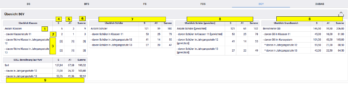 Im Bereich der Grundbereichsberechnung ist für das BGY eine Zusammenfassung der Schüler- und Klassenzahlen und Berechnungen. Grundlagen für diese Berechnungen sind die Klassenbildungsmaske und die Kursbildung bei BGY. Auch wenn in der Kl. 11 der Unterricht im Klassenverband stattfindet, ist die Berechnung in einer an die Kursbildung abgebildeten Tabelle.