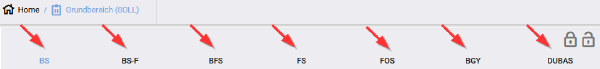Die Berechnung des Grundbereichs erfolgt schulartbezogen. Es gibt für jede in der Schule vorhandene Schulart eine eigene Registerkarte. In den Registerkarten „BGY“ und „DUBAS“ werden die benötigten Stunden dargestellt, die in den Menüpunkten Planung/Kurbildung BGY (SOLL) und Planung/Kursbildung DuBAS (SOLL) berechnet werden. Der Grundaufbau der Registerkarten und damit die Bedienung ist immer gleich, bei einzelnen Schularten werden eventuell zusätzliche Spalten dargestellt (bspw. bei der Fachschule für Praktikumsbetreuung).