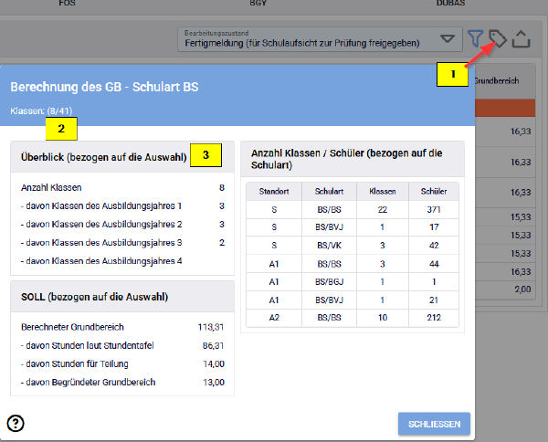 Bei diesem Schritt hat die Schulaufsicht noch keine Sicht auf die Masken der Grundbereichsberechnung der Schulen.