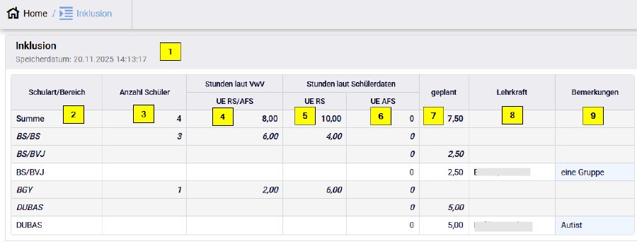 - die Maske stellt eine Übersicht über die verplanten Stunden im Bereich Inklusion dar