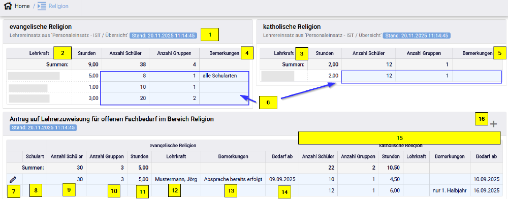 | 7 | Bereich Religion | Übernahme aus Planung/Personaleinsatz (IST)/Religion |