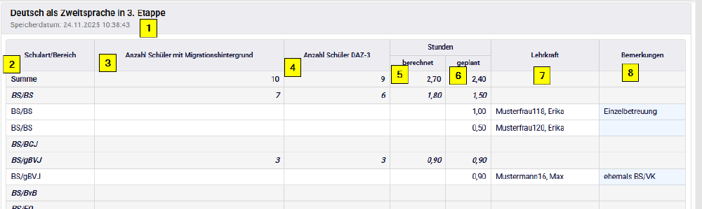 - die Maske stellt eine Übersicht über die verplanten Stunden im Bereich DaZ in der 3. Etappe dar