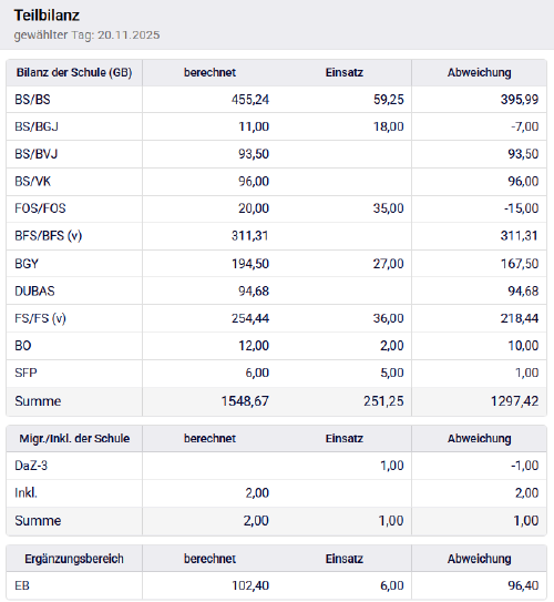 - Sind bei Abweichungen positive Zahlen dargestellt, wurden noch nicht so viele Stunden vergeben, die durch die GB-Berechnung oder Schülerzahl theoretisch berechnet wurden.