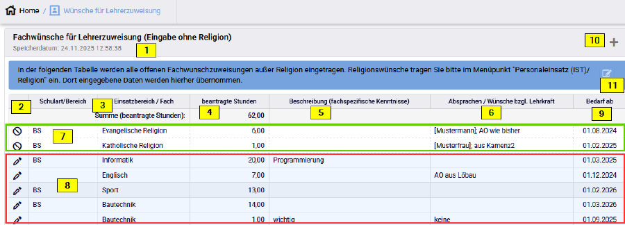 | 12 | Wunsch-Lehrkraft | falls bereits abgesprochen oder als neue Abordnung geplant |