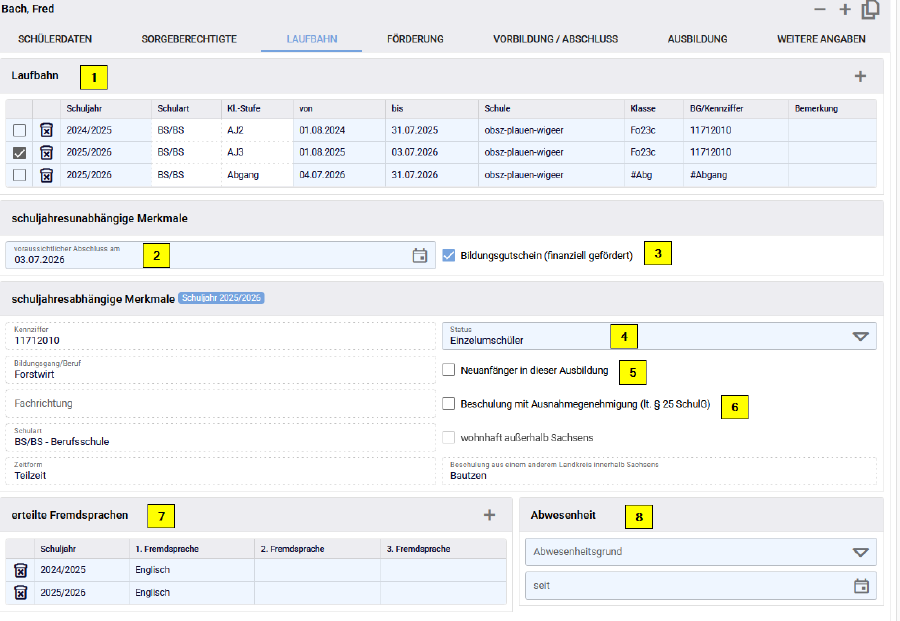 Die Eintragungen im Register „Laufbahn“ werden für Statistiken, wie z.B. Amtliche Schulstatistik und Schülerbewegung genutzt. Die Laufbahnen von Schülern sind durch die Nutzer der Schule frei editierbar, wenn der Schüler Stammschüler dieser Schule ist. Wenn sich Zeitscheiben überschneiden, wird dies durch Rotfärbung kenntlich gemacht, eine Speicherung ist dann nicht möglich. In der Laufbahn sind für das Bundesland Sachsen alle öffentlichen berufsbildenden Schulen auswählbar. Damit ist auch die Pflege von Schulzeiten für vergangene Zeiträume möglich.