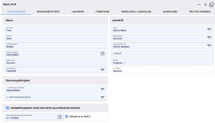 Alle Felder außer Geburtsname müssten ausgefüllt sein, da sie bei der Eingabe eines neuen Schülers oder beim Import aus einem anderen Programm Pflichtfelder sind.