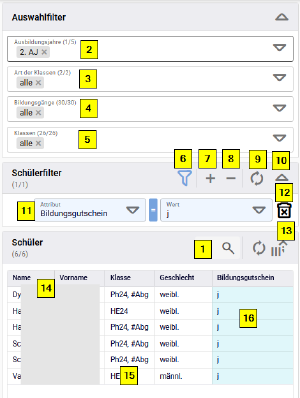 | 7 | Auswahl der anzuzeigenden Schüler | Klick auf das Symbol |
