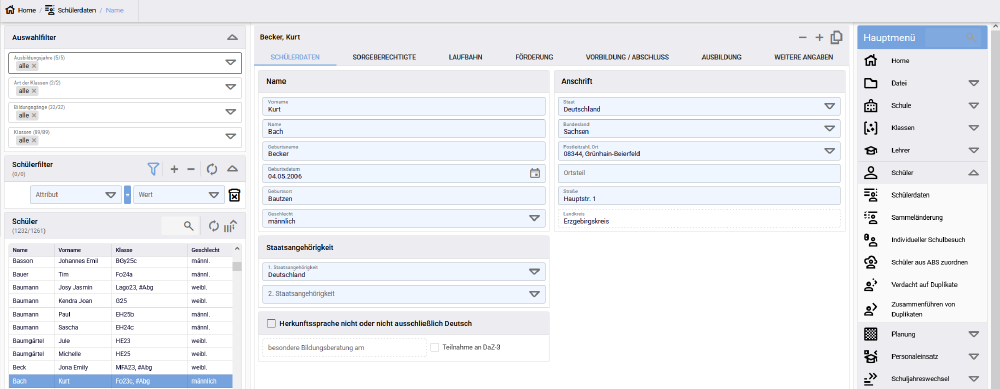 - Im mittleren Bereich werden die Details der Schülerdaten in verschiedenen Registerkarten dargestellt.