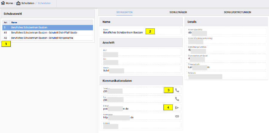 Anzeige der Daten der Schule: Die Daten können in SaxSVS nicht verändert werden. Alle Änderungen, auch der Kommunikationsdaten, sind der Sächsischen Schuldatenbank zu melden. Bei Korrekturbedarf an Schuldaten, sind die in der Schuldatenbank vorhandenen elektronischen Formulare zu nutzen. (über https://schuldatenbank.sachsen.de)