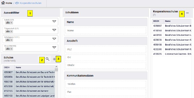 Dieser Punkt kann zur Anzeige der Grunddaten der sächsischen Schulen und zur Kennzeichnung ausgewählter Schulen als Kooperationsschule genutzt werden. Das betrifft Schulen, mit denen häufig Kontakt besteht, z. B.: