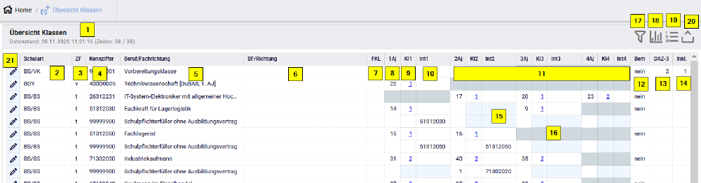 In diesem Menüpunkt erhält man eine Zusammenfassung der Auszubildenden/Schüler mit entsprechenden Klassen. Diese Maske dient nur zur Zusammenfassung und kann nicht bearbeitet werden.