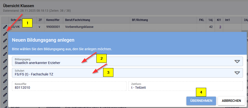 - jeder Bildungsgang mit entsprechender Fachrichtung kann pro Ausbildungsjahr nur einmal als Klasse angelegt werden