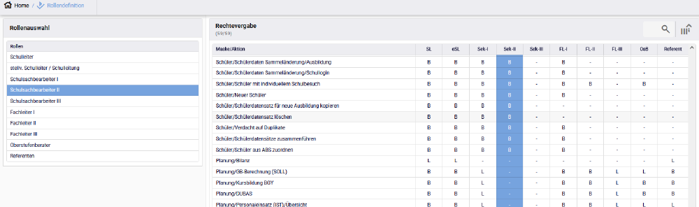 Da die Aufgabenverteilung in den BBS sehr unterschiedlich ist und die Rollendefinition sachsenweit gilt (und damit nicht innerhalb der Schule angepasst werden kann), wurden einige Rollen weiter untersetzt. So kann der Schulleiter entsprechend der Notwendigkeit die richtige Rolle auswählen.