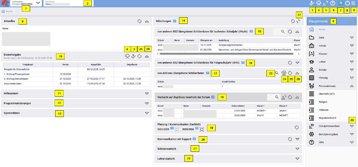 Die Startseite (Home) bietet den Nutzern wichtige Informationen zur Schule und zum Programm. Es wird grundsätzlich beim Start des Programms angezeigt. Die Startseite lässt sich jederzeit über das Menü "Home" aufrufen.