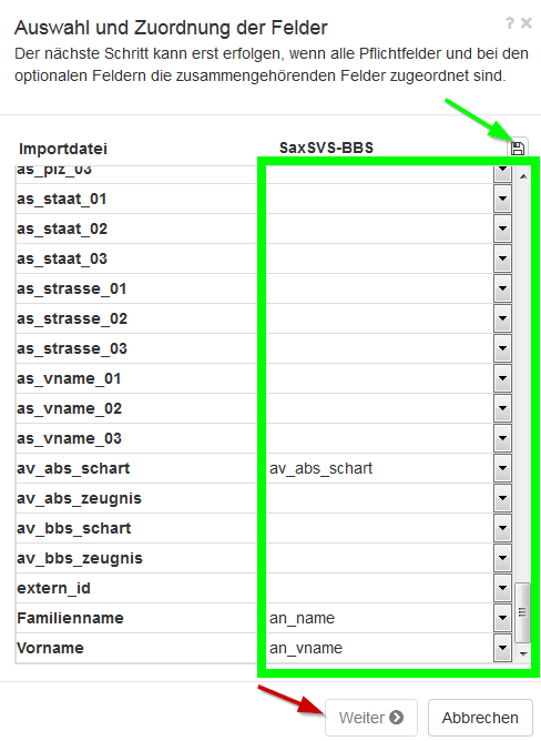 • alle Felder zuordnen, bei denen der Inhalt eingelesen werden soll