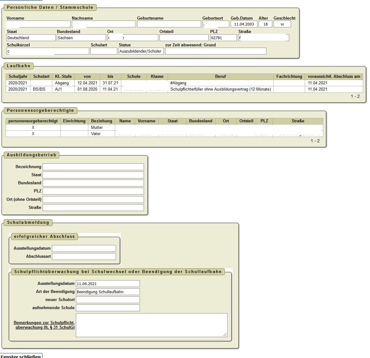 Der Mitarbeiter des Trägers, der für die Schulpflichtüberwachung verantwortlich ist, bekommt zusätzlich folgende Maske: | Der Mitarbeiter des Trägers, der für die Schulpflichtüberwachung verantwortlich ist, bekommt zusätzlich folgende Maske: | ||