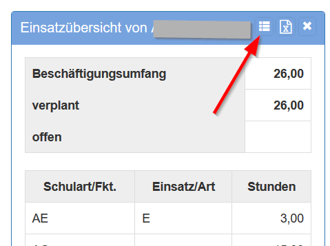 Durch Klick auf die Lupe vor den Bereichen in der linken Tabelle öffnet sich eine 2. Tabelle mit Detailinformationen. Hier stehen nun alle Lehrkräfte mit Beschäftigungsumfang und offenen Stunden.