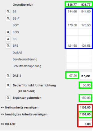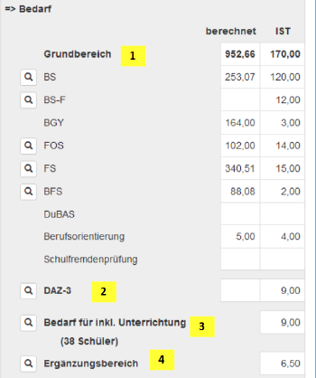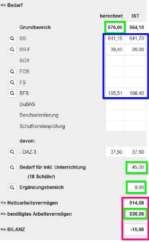 Der nächste Abschnitt berechnet den Bedarf. Auch hier werden der Bedarf aus der Grundbereichsberechnung und die bereits verplanten Stunden durch die Schule gegenübergestellt.