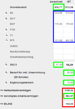 - die Schularten BS und BFS sind überbucht (es wurden mehr Stunden den LK zugewiesen als bei der GB-Berechnung berechnet wurden)