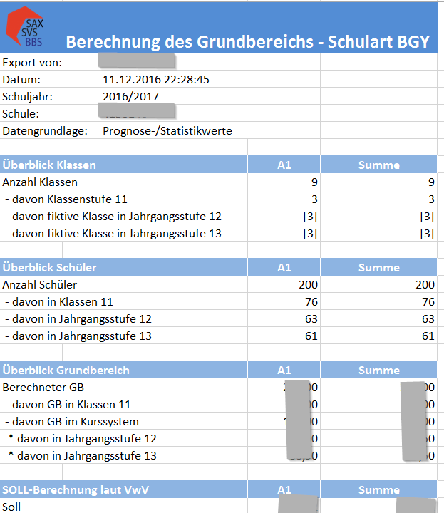 Im Bereich der Grundberechnung ist für das BGY eine Zusammenfassung der Schüler- und Klassenzahlen und Berechnungen. Grundlagen für diese Berechnungen sind die Klassenbildungsmaske und die Kursbildung bei BGY. Auch wenn in der Kl. 11 der Unterricht im Klassenverband stattfindet, ist die Berechnung in einer an die Kursbildung abgebildeten Tabelle.