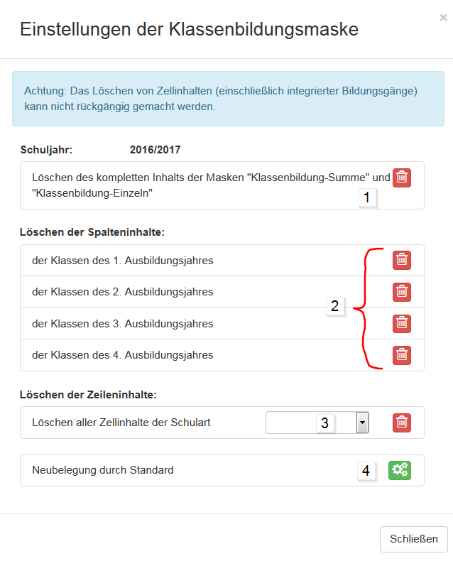 | 3 | schulartweises Löschen | wenn sich in einer Schulart große Änderungen ergeben, können diese Zeilen geleert und neu eingetragen werden |