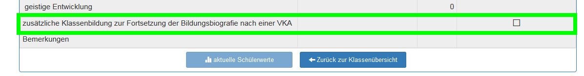 - In der Schulart .../BVJ ist eine Kennzeichnung erforderlich, falls die Klasse zusätzlich wegen Schülern gebildet wurde, due bisher eine VKA besucht haben.