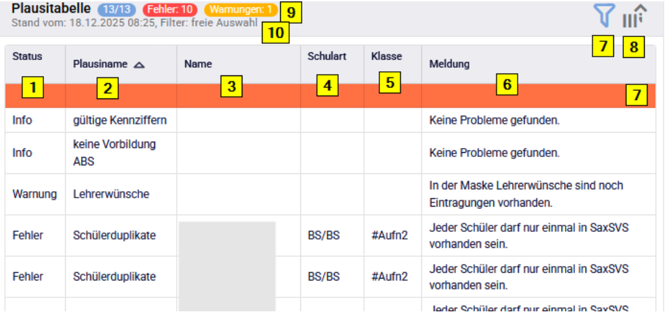 | 7 | Leiste zum Filtern der Daten | damit können alle Plausi bezogen auf einen Schüler gefiltert werden |