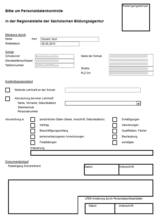 Ein Großteil der Personaldaten kann von den Schulen in SaxSVS-BBS nicht bearbeitet werden. Dies betrifft zum Beispiel die Namen, die Arbeitsvertragsdaten, den Beschäftigungsumfang, Ermäßigungen, Freistellungen sowie personenbezogene Anrechnungen. In SaxSVS-BBS wurde ein Formular integriert, welches die Schule bei der Meldung von Abweichungen unterstützt.