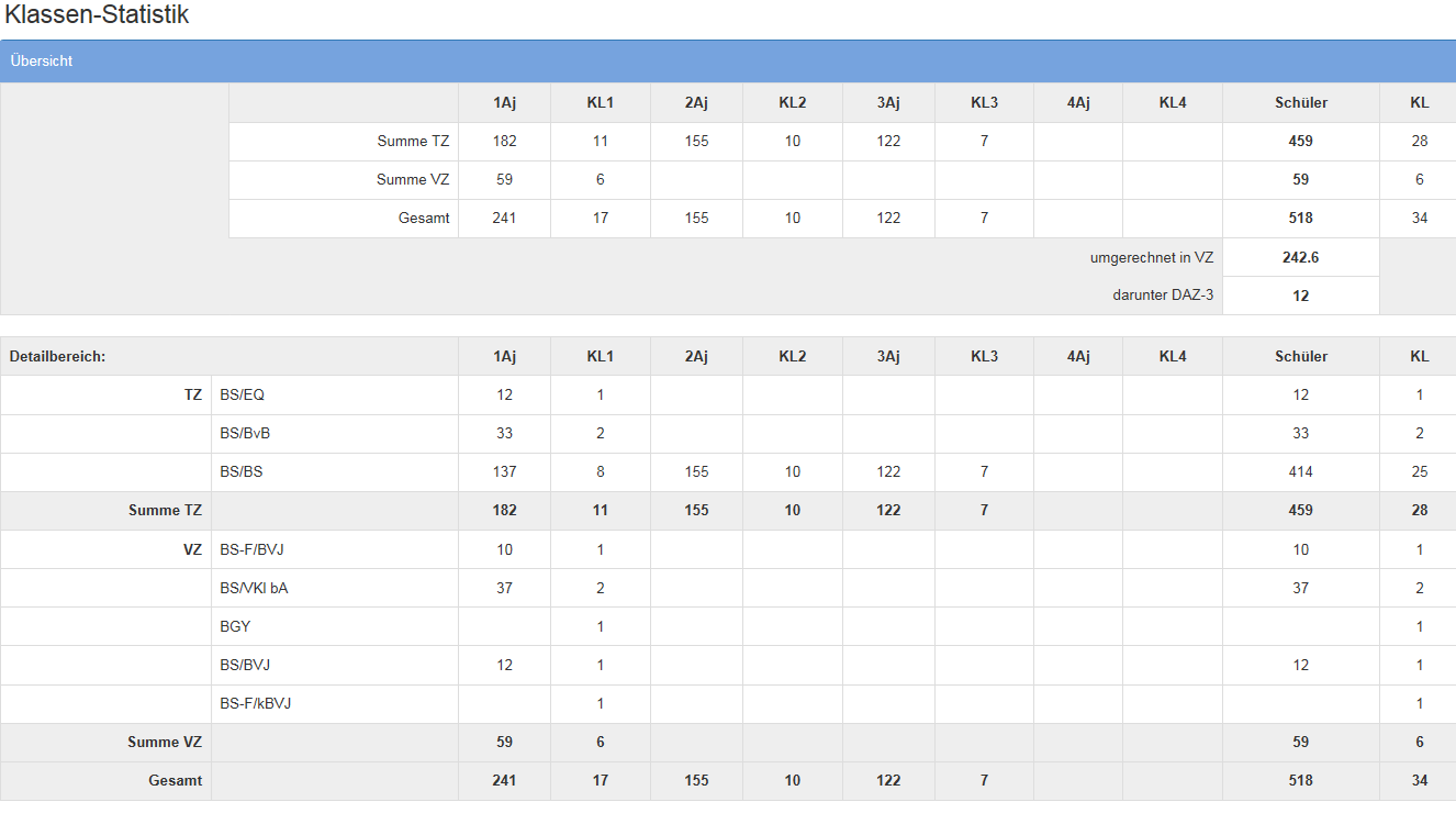 In diesem Menüpunkt erhält man eine Zusammenfassung der Auszubildenden/Schüler mit entsprechenden Klassen. Diese Maske dient nur zur Zusammenfassung und kann nicht bearbeitet werden.