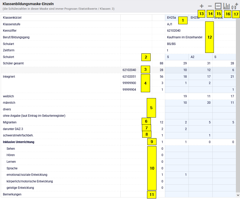 | 8 | Schülerzahl | diese Schülerzahl ist nur eine Teilmenge der Klasse, wenn mehrere Bildungsgänge in der Klasse beschult werden |