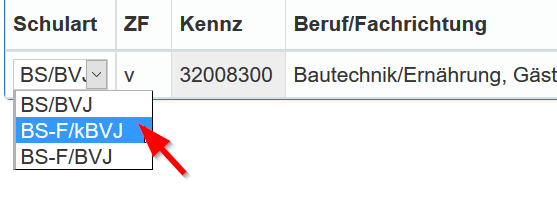 Die Zelle wird mit ENTER bestätigt --> die Zellen Schulart, ZF, Kennziffer sowie BF/Richtung werden automatisch befüllt. Schulart und Zeitform (ZF) können in der Spalte Schulart noch bei einigen Bildungsgängen/Fachrichtungen geändert werden.